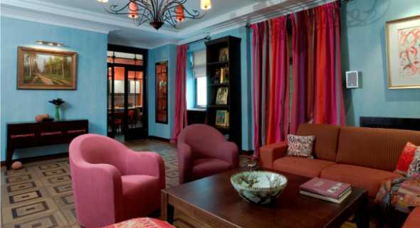 Красный диван с элементами синего подойдет для классического интерьера. Если добавить тематические декоративные элементы, то можно получить морской, восточный или стиль рустика.
