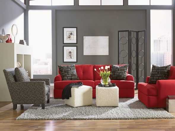 Чистый красный цвет мебели гармонично смотрится со светлыми стенами, белый, кремовый, бежевый, серый.