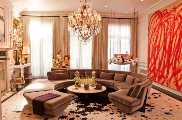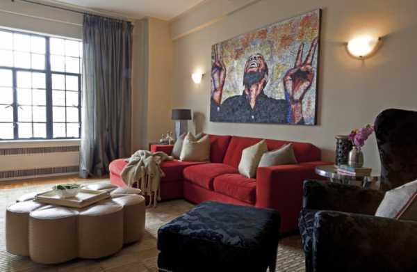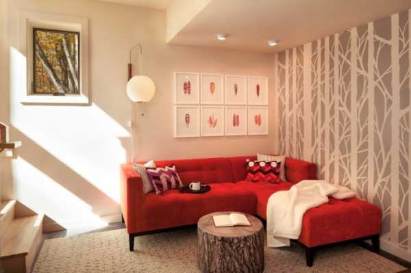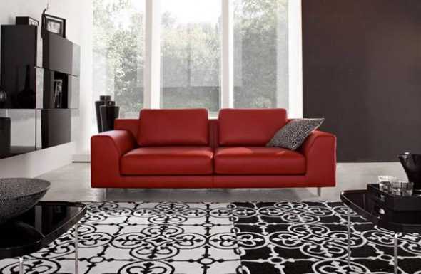 В просторном зале будет неуместно смотреться миниатюрный красный диван. Комнату может оформлять классический диван-книжка в компании с двумя креслами одного или разного цвета. Так же в гостиной гармонично смотрится угловая или модульная модель, в зависимости от планировки он может занимать место в углу или в центре комнаты.