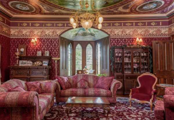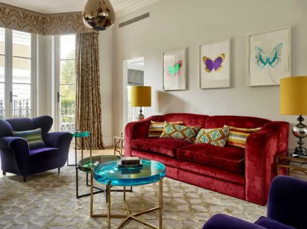 Богатая комбинация цвета. Необычный узор на красном диване в компании с винтажными креслами сделают интерьер гостиной роскошным.