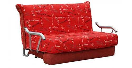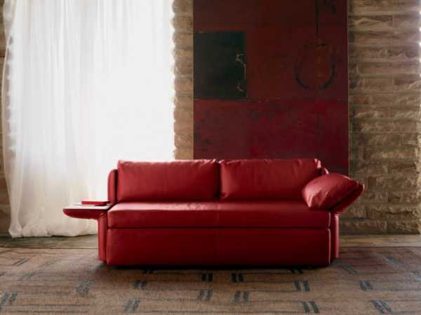 Для гостиной небольшой площади подойдет компактный красный диван-книжка или модель с подлокотниками-полочками, они подарят полезное пространство.