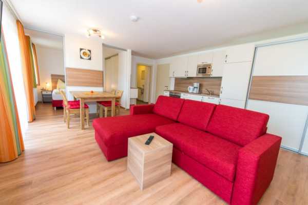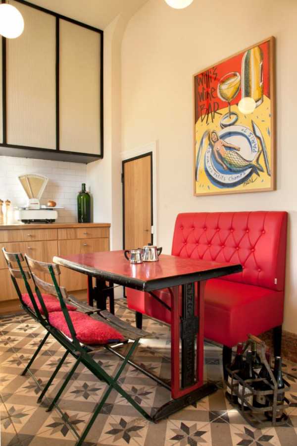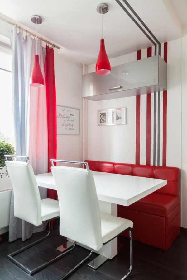 В кухне чаще всего используют небольшой, не раскладной красный диванчик окружающий обеденный стол.