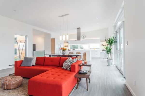 Красный диван обозначит зону отдыха в гостиной. Подушки и покрывала, перекликающиеся с другими оттенками, свяжут интерьер воедино.