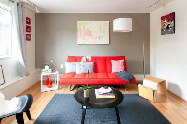 В условиях минималистичного стиля красный диван станет ярким пятном. Интерьер комнаты получается стильным.
