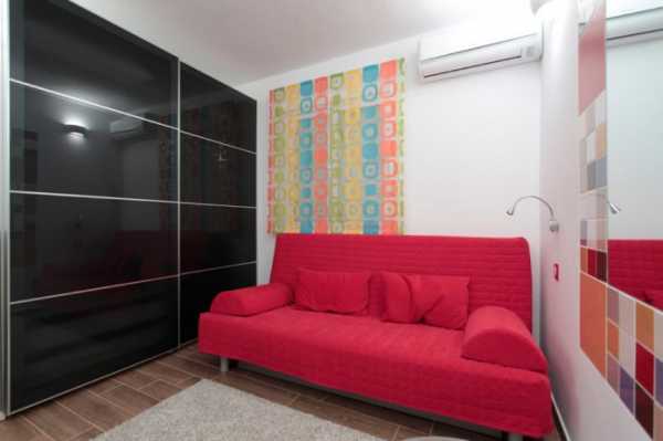 Глубокий красный с винными нотками сделает спальню романтической. Диван может быть основным спальным местом или отдельной зоной отдыха.