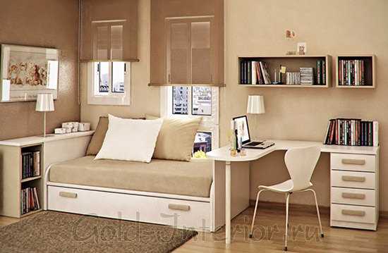 Бежевый цвет станет нейтральным фоном, который могут украшать разноцветные подушки и покрывала. Для детской комнаты подойдет раскладной мини-диван или диван-кровать. Диван имеет преимущество перед кроватью в том, что в сложенном состоянии остается больше свободного места для игр.