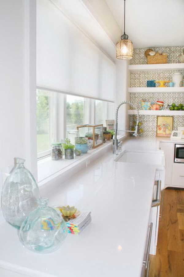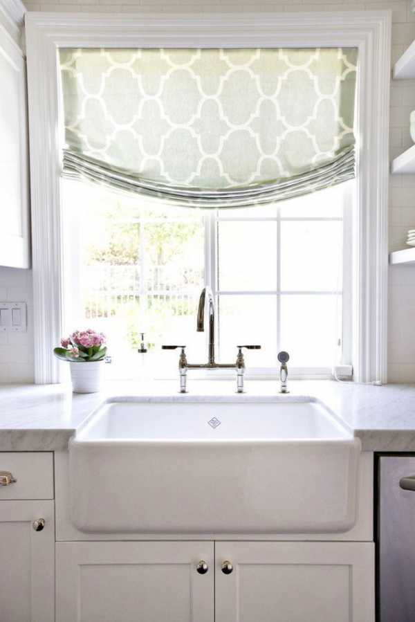 Полезный совет! Римские шторы, установленные в глубине окна на кухне, позволят увеличить кухонное пространство, при этом используя подоконник как дополнительную рабочую зону или полку под всевозможные аксессуары.