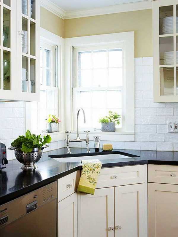 — Если вам повезло и в помещении есть угловое окно, то вы получите бонус в виде обилия естественного света и максимального использования пространства под мойкой, где можно хранить хозяйственные мелочи и разную утварь.