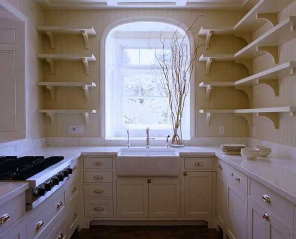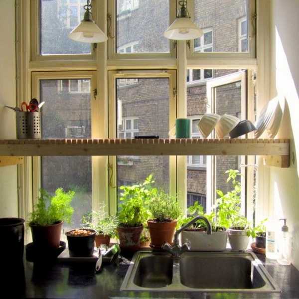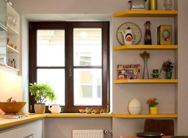 — Если ваша кухня очень малого размера, то естественное освещение добавит ей ощущение простора. Для того чтобы использовать каждый сантиметр площади с пользой, можно разместить несколько полок прямо в оконном проёме.