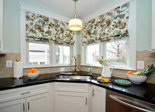 - Рулонные шторы – напоминают римские, но при открывании сворачиваются в рулон. Обычно изделие шьют из плотной, иногда даже 100% непрозрачной ткани, поэтому чаще всего используют для помещений с южной стороны. На фото – кухонный эркер с рулонными шторами.