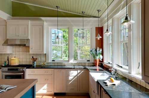 - Кухня с двумя окнами. Для такого интерьера лучше подойдут узкие длинные шкафчики, куда можно встроить бытовую технику, спрятать посуду. Если в помещении потолки высокие, можно установить антресоли небольшой глубины. Стол можно разместить возле одного из оконных проемов. Что касается декора, то оба проема лучше оформить в одном стиле.