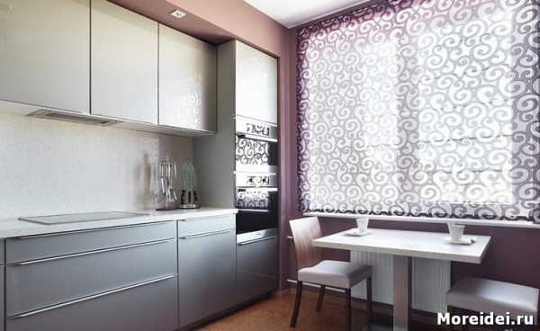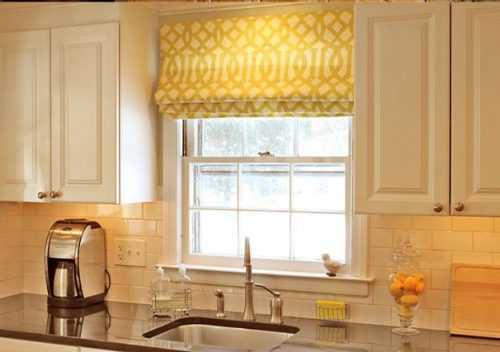 Римский вариант штор в кухне с окном придется по вкусу тем, кто предпочитает четкость линий, лаконичную простоту и функциональность.