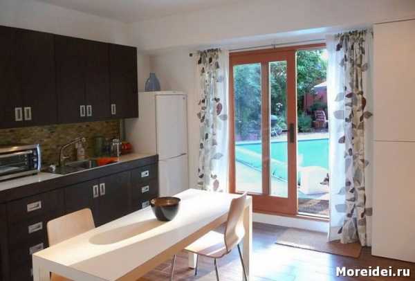 - Размеры – не желательно, если речь не идет о столовой, шторы длиной до пола: изделие будет пачкаться намного быстрее. Короткие занавески и выстирать легче, и снять с карниза проще. Шторы к тому же занимают место, поэтому модели, устанавливаемые на створку, вовсе не отнимают площади кухни.