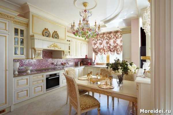 - Если обеденный стол размещается рядом с окном, но не составляет с ним единое целое, то окно входит в обеденную зону, а, значит, и дизайн его будет более ярким и оригинальным. Рабочая зона, особенно газовая плита, при этом оказывается далеко, количество конденсата и брызг минимально, поэтому можно позволить и некоторые декоративные приемы. Те же подхваты на длинных классических шторах, гардины и портьеры с неровным краем, имитирующие собой сваги, несложные ламбрекены, легкие струящиеся ткани и так далее. На фото – оформление в классическом стиле.