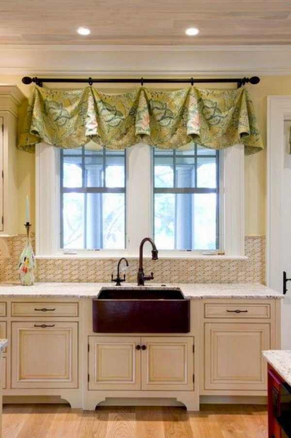 - Если подоконник включен в рабочую зону и представляет собой столешницу, мойку или плиту, вопрос со шторами решается автоматически. Занавески, даже самые короткие будут изрядно мешать, а рядом с газовой плитой еще и увеличивают опасность пожара. Здесь можно установить металлические жалюзи, а для красоты – короткие занавески а-ля кафе, но не в нижней, а верхней части проема. Если кухня декорируется в классических стилях, то верх оформляют ламбрекеном или короткой занавеской, имитирующей его, как это демонстрируется на фото. Гардины, соответственно, не допускаются.