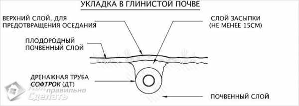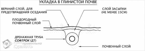 Глинистая почва плотная и тяжелая, поэтому для улучшения дренажных свойств грунт следует тщательно разрыхлить. В процессе прокладки дрен необходимо обходить места, предназначенные для проезда автомобиля.