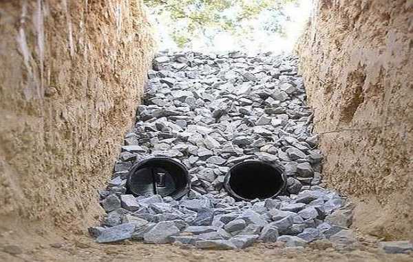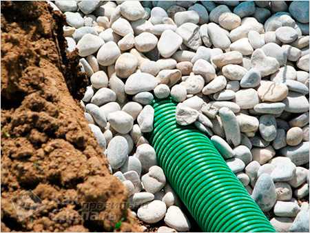 Укладка дренажных труб Траншеи засыпаются щебнем и мелкими камешками. Это позволит влаге легко поступать к трубам.- Трубы выводятся в магистральные колодцы и траншеи. Можно вывести их к другим источникам дренажной системы.