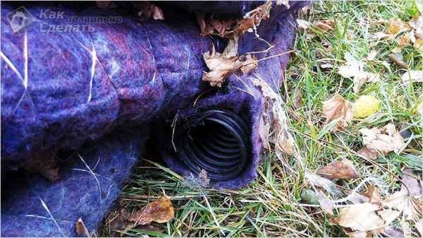 Пластмассовые трубы с маленькими отверстиями вдоль стенок необходимо обернуть геотекстилем. Сделать это нужно в 1-3 слоя.