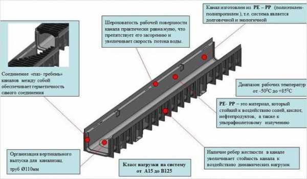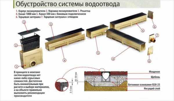 Такая система состоит из водосборников, которые, в свою очередь, связаны с канализацией. Устройства сбора воды обычно устанавливаются под водостоками, в низинах и под кранами. - Линейный. Система напоминает канал, который имеет склон в сторону колодца. Именно туда поступает влага от ливней.