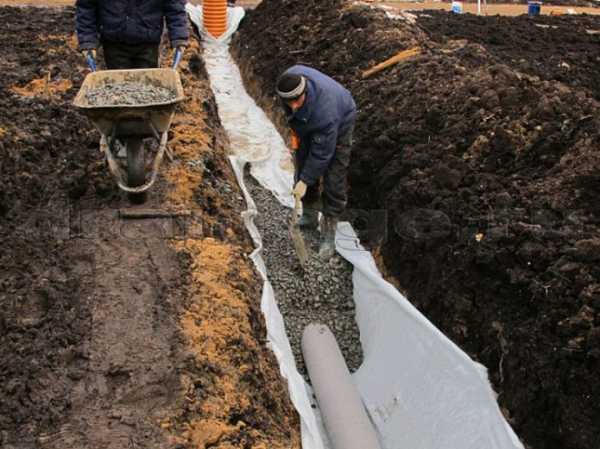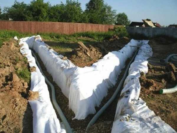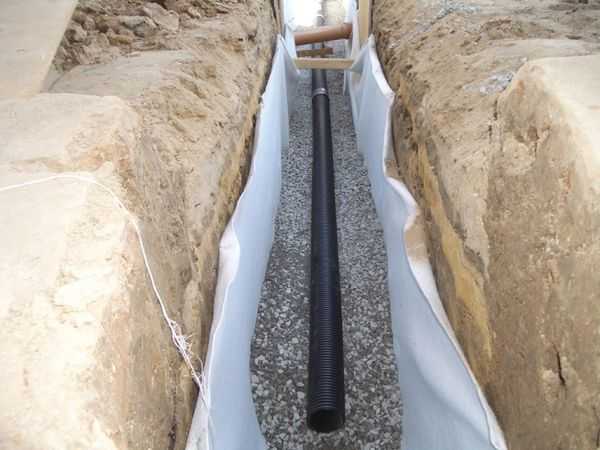 Затем трубы укладываются в траншею. Сверху можно заложить еще один слой геотекстиля. Соединять трубы нужно при помощи тройников, а также разнообразных муфт и уголков.