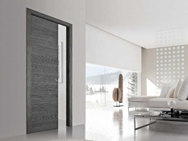 Тип открытия также характеризует современный стиль двери. Это могут быть горизонтальные раздвижные механизмы, передвигающие дверное полотно при открытии за стену.