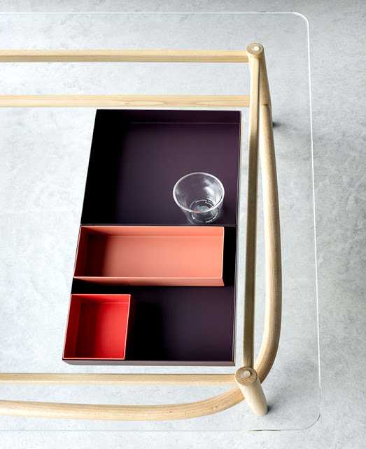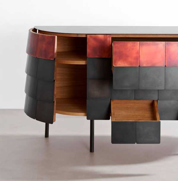 На выставке современных идей дизайна гостиной 2018 были представлены и оригинальные предметы, например дизайнерский стол, который создан по принципу чешуи. Для визуального выделения необычной вещи необходим яркий и насыщенный цвет стен в тон. На этом фоне металлический каркас придает четкость форме серванта.