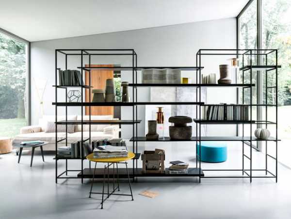 - Стеллажи с обилием полок занимают всю стену, что дает возможность расстановки предметов, гармонирующих по форме, и открывает зрению узор поверхности стены. Хороший пример тому стеллажи LEMA Selecta.