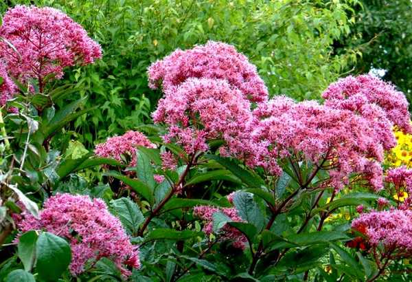 Совсем неприхотлив высокорослый посконник, его розоватые листья идеально сочетаются с деревьями в саду, потому что оттенок растения с каждым летним месяцем изменяется.