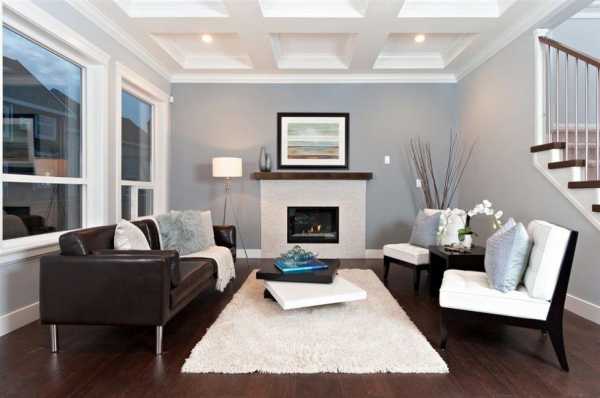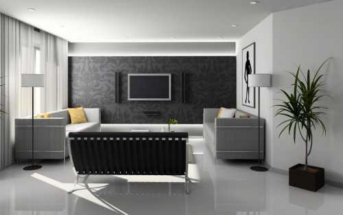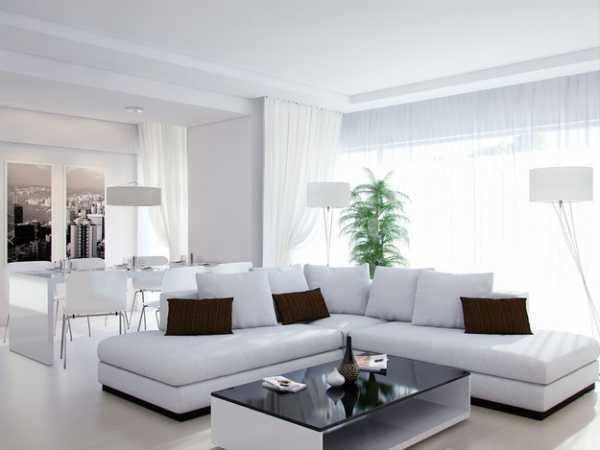 Основополагающая цветовая тенденция. Если для отделки стен вы выбрали белый цвет, старайтесь придерживаться данной цветовой тенденции в процессе выбора цвета напольного покрытия, мебели и подбора аксессуаров. В виду этого, отдавайте предпочтение светлым тонам, избегая резких, контрастных переходов, за исключением черного цвета, который в сочетании с белым придает особое монохромное величие гостиным.