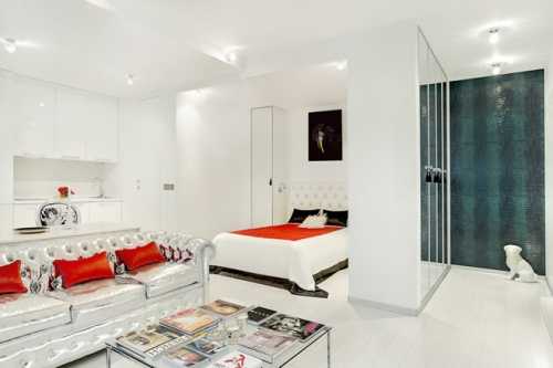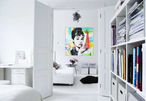 Все стены в белом цвете утомительны. Поэтому если делать дизайн квартиры в белом цвете, то обязательно к монотонным стенам нужно добавить ярких красок в виде, ярких фотографий или живописи.
