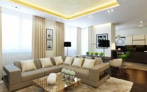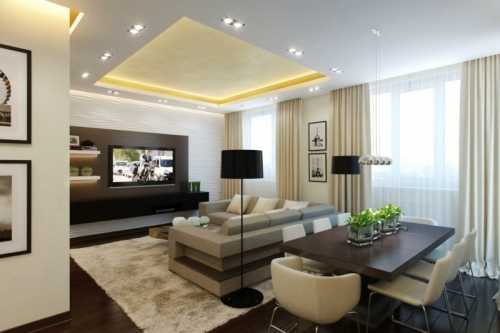 Постепенно получает свое признание новый способ организации потолочных конструкций – визуальное поднятие потолков за счет плафона, утопленного в специально предусмотренной для этого нише овальной или круглой формы. Противоположное решение для чрезмерно высоких потолков. Их можно сделать несколько ниже, за счет установки подвесного круга, к которому в последующем крепят низко висящую массивную люстру, состоящую из нескольких плафонов. Цветовая гамма такой люстры может выходить за рамки белой и быть чрезвычайно разнообразной: от бежевой и песочно-золотистой до бронзовой, декорированной серебряной инкрустацией. Если окна вашей гостиной ориентированы на солнечную сторону, вы находитесь в более выигрышном положении, так как ваша цель ограничивается сохранением и визуальным преумножением естественного освещения. В этом случае вы можете дополнить интерьер не только невесомым тюлем, но и слегка тяжеловатыми гардинами, декорированными ламбрекенами.