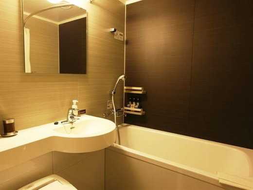 Классическое решение для небольшой узкой комнаты – сантехника расположена по длине помещения, а совмещенная с душем ванная параллельно им. Коричнево-бежевая гамма делает комнату более теплой и уютной.