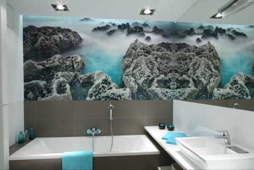 Современные технологии позволяют нанести на кафельную плитку 3Д изображения. Вид побережья, песка или гальки, моря также помогают «раздвинуть» стены. Создается иллюзия, что за стеклом натуральный морской пейзаж.