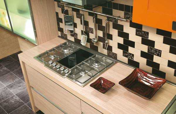 Кафелем при этом часто оформляется не только пол, но и пространство рабочей поверхности и не зря, потому, что такая поверхность смотрится очень красиво, не впитывает запахи и влагу, долговечна, а также легка в уборке.