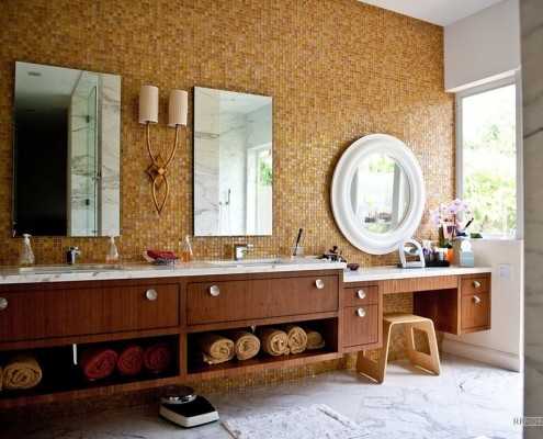 * Стены рекомендуется облицовывать однотонной или с мелким рисунком керамической плиткой. В противном случае комната будет выглядеть слишком пестро и вызывающе.