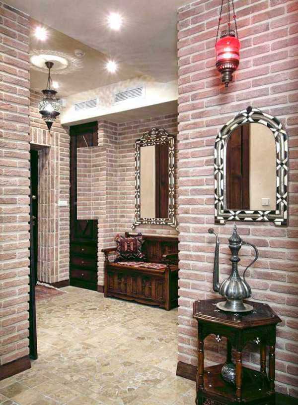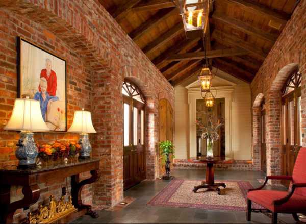 Роскошный вид имеет прихожая, все стены которой выложены из плитки под кирпич.