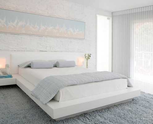 Для такой стены лучше использовать пастельные тона или просто белый цвет, потому что это место предназначено для отдыха. В спальне часто используются яркие цвета и такая акцентная светлая стена будет уместна.