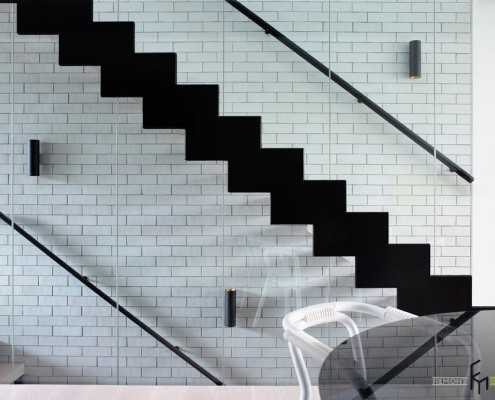 Установленные вдоль стены, деревянные перила создают потрясающий эффект старинного проспекта. Противоположная сторона прихожей окрашена в белый цвет, чтобы не отвлекать от нестандартного дизайнерского решения.