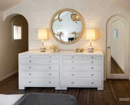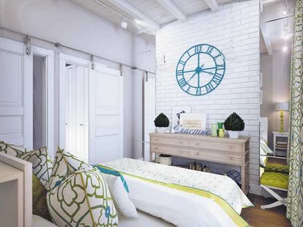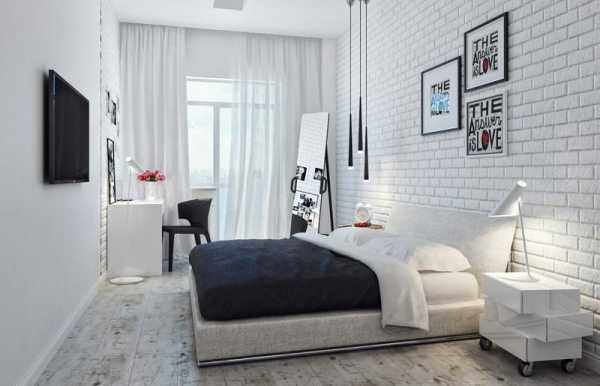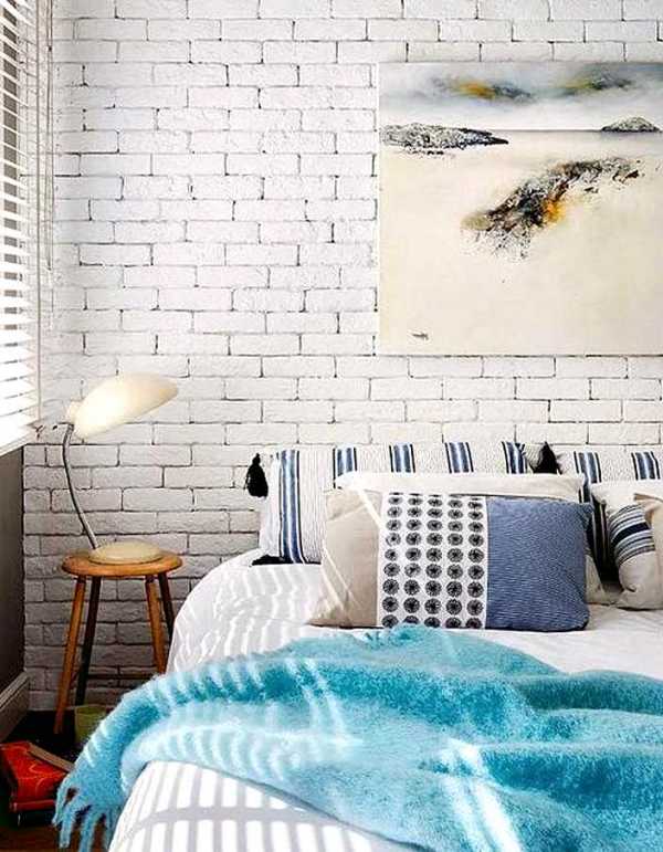 В спальне под белый кирпич достаточно отвести одну из стен, желательно в изголовье кровати – это очень оживит помещение и сделает его более уютным.
