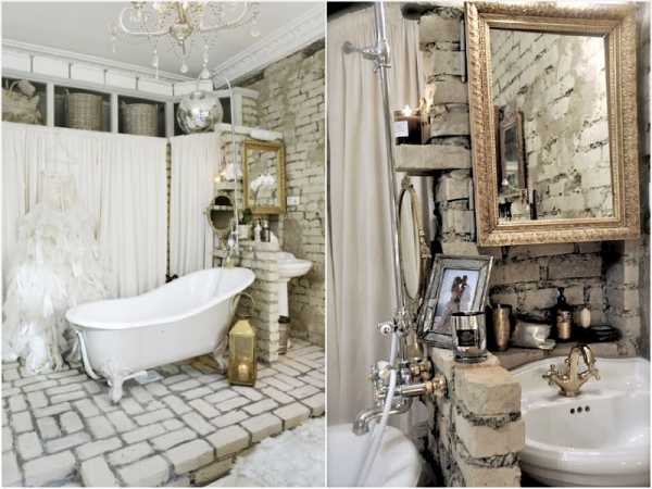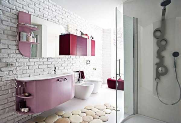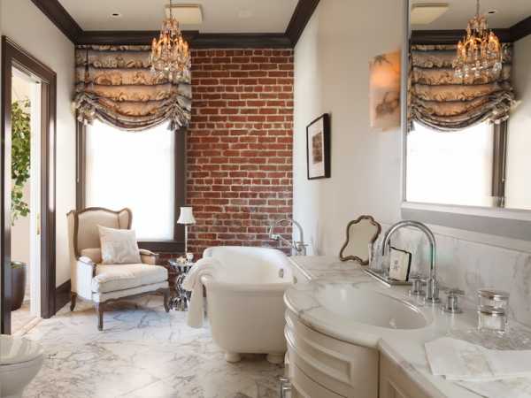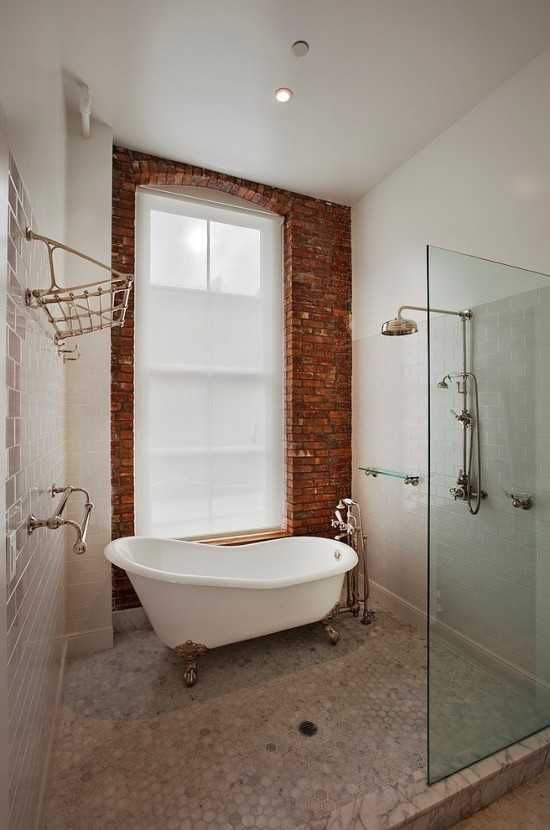 Смело и необычно выглядит кирпич в ванных комнатах.