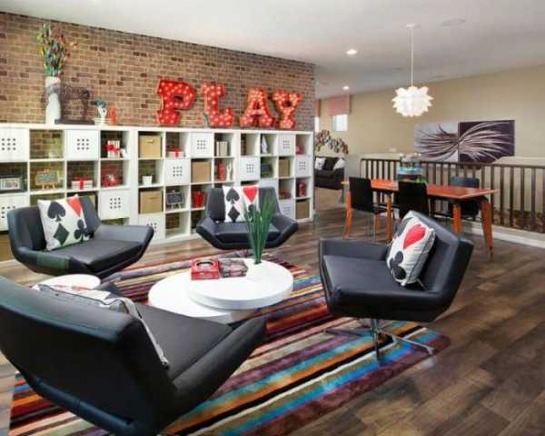 Несмотря на то что темный кирпич присутствует на всех стенах гостиной, интерьер не выглядит мрачно и скучно. Его замечательно освежает светлый диван с яркими подушками, удобное кресло и красный стулья у небольшого столика возле стены.