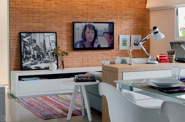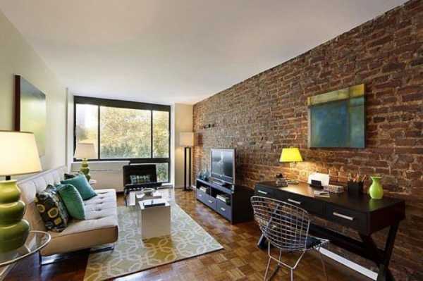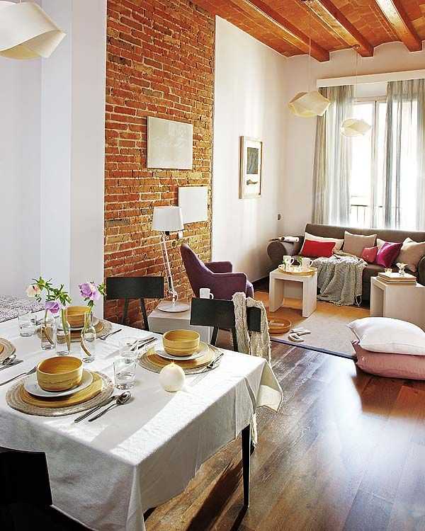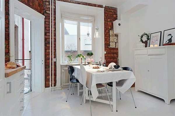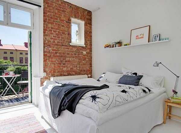Если вам не по душе классический красный кирпич, можно покрасить кирпичную стену белоснежной краской. Комната будет выглядеть очень свежо и зрительно просторнее. Ведь как известно, белый цвет – отличный помощник в дизайне маленьких квартир.
