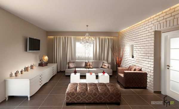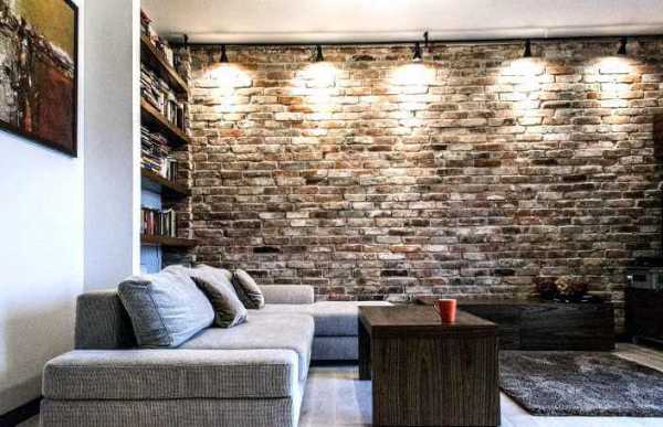 Кирпичная плитка в гостиной может сделать стену акцентной, а точечная подсветка придаст атмосфере загадочности и таинственности