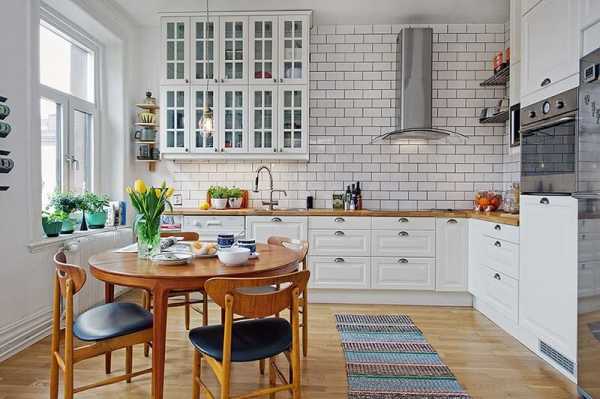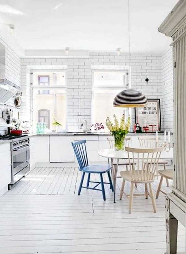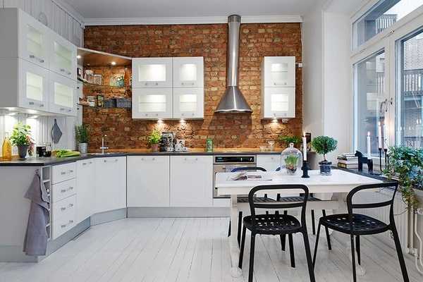 Белый кирпич в интерьере кухни на фото чистый и светлый. Но применение такого варианта требует дополнительной обработки материала и особого ухода