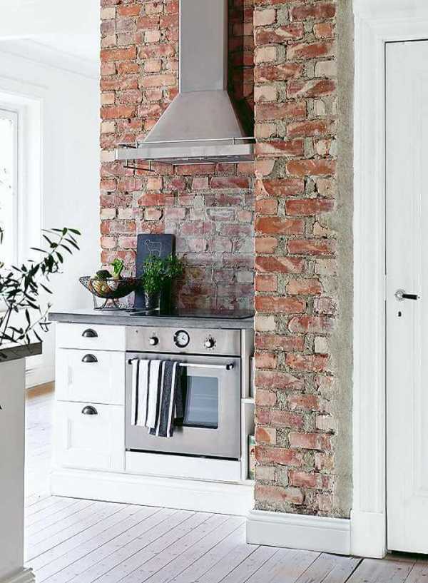 Кирпич – экологичный и термически устойчивый материал, отлично подходящий для кухни. Лично мне очень нравится яркий красный кирпич в сочетании с современной белоснежной кухней.