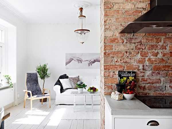 Белый кирпич в интерьере скандинавского дизайна органично впишется в в общую линию и подчеркнёт свежесть и минимализм стиля