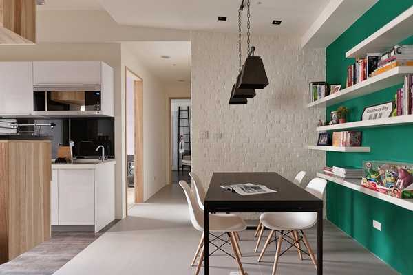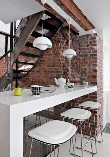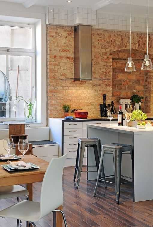 Не менее интересно выглядит кирпичная стена в обеденной зоне кухни.