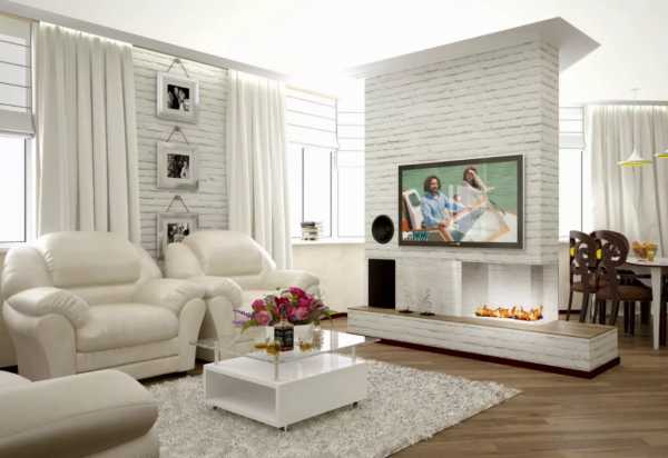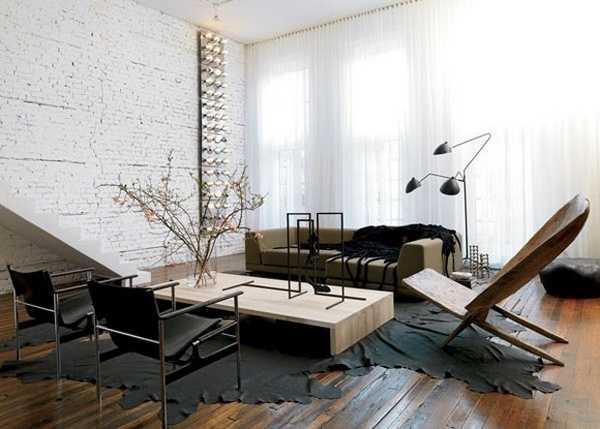 Белые стены будут универсальны при выборе аксессуаров и мебели. Кирпичная кладка сама по себе немного неуютна, ее необходимо дополнить наличием дивана, мягких подушек или напольных светильников и занавесок на окнах. Тогда в гостиной будет приятно находиться, от нее будет веять теплотой. Кирпич часто применяют в декоре камина, этот способ подойдет и для электрических моделей. Выигрышно смотрятся телевизионные панели, обрамленные белым кирпичом.