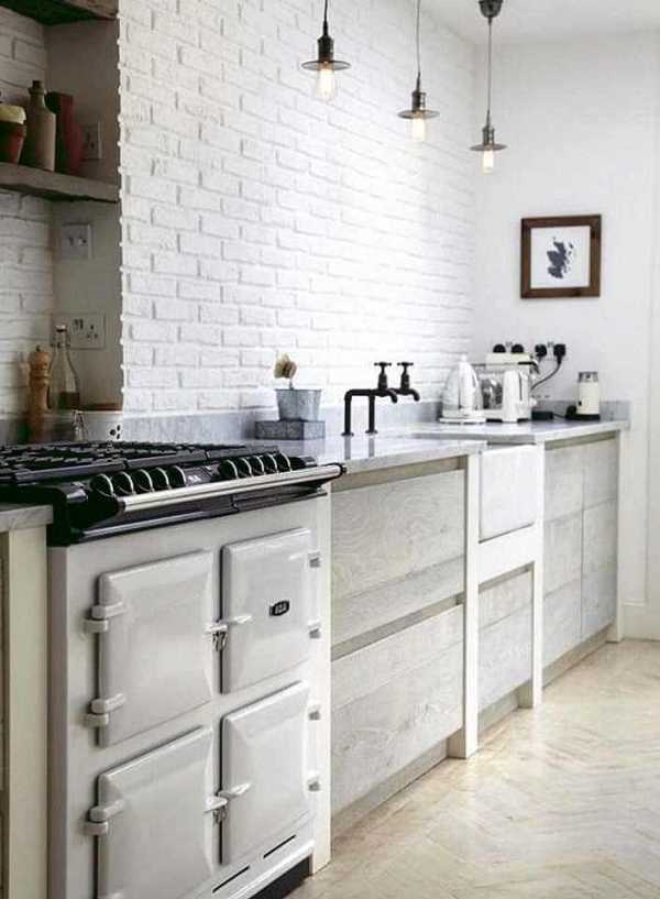 В кухонном помещении белая кирпичная кладка смотрится также весьма интересно. Светлым кирпичом можно украсить не только кухонный фартук, но и барную стойку. Этот материал прекрасно сочетается со всей современной кухонной техникой.