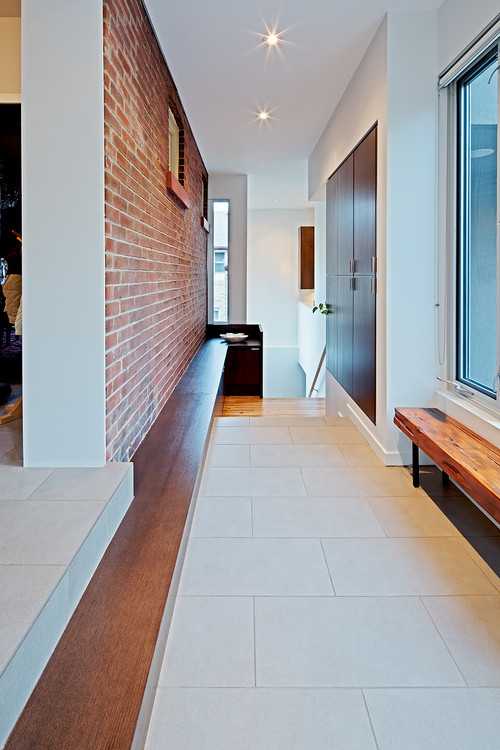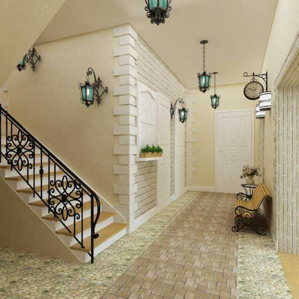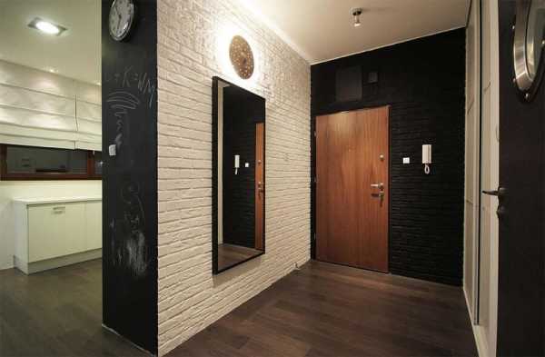 Использование белой кирпичной кладки в холле позволит зрительно расширить площадь помещения. Существенным плюсом применения этого материала в такой комнате является его устойчивость к стиранию и гниению – грязные поверхности легко очищаются и моются.